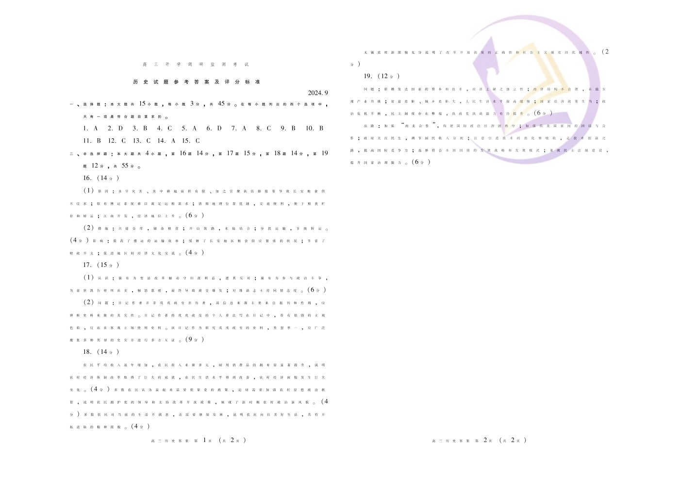 山东省潍坊市2024.9高三开学调研监测试题历史答案