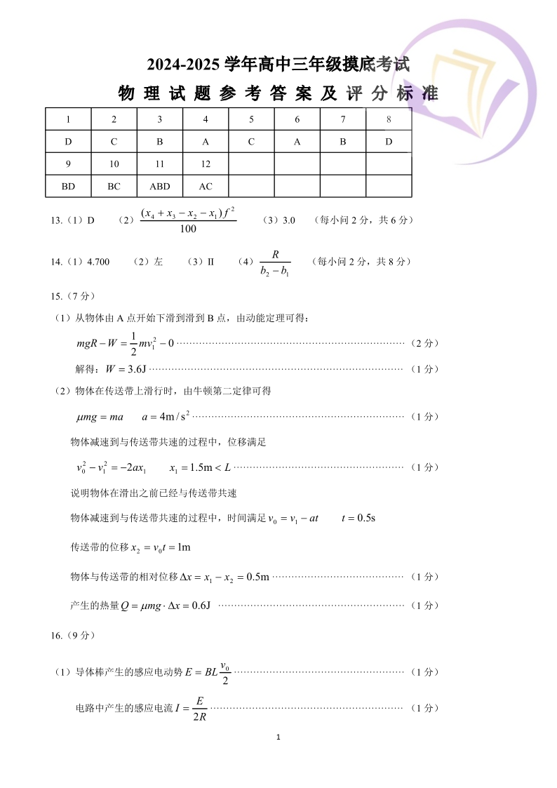 山东省济南市2024.9高三开学统一摸底考试物理答案