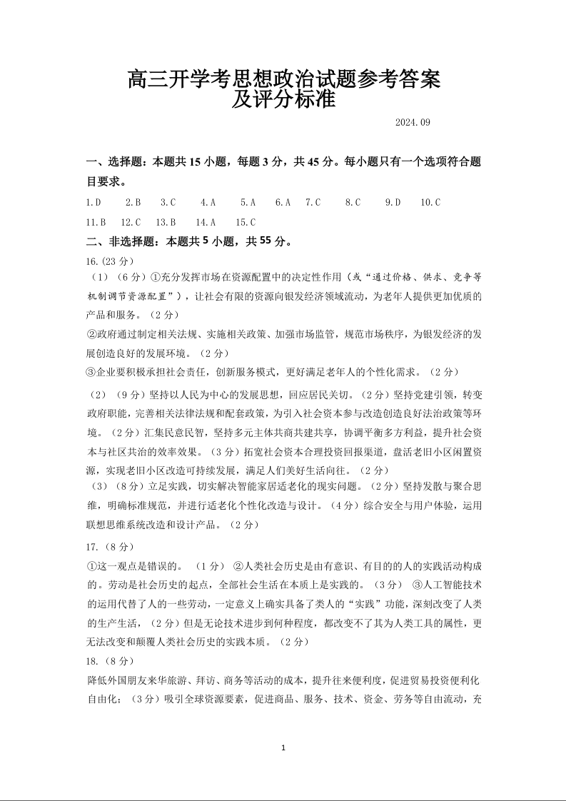 山东省济南市2024.9高三开学统一摸底考试政治答案