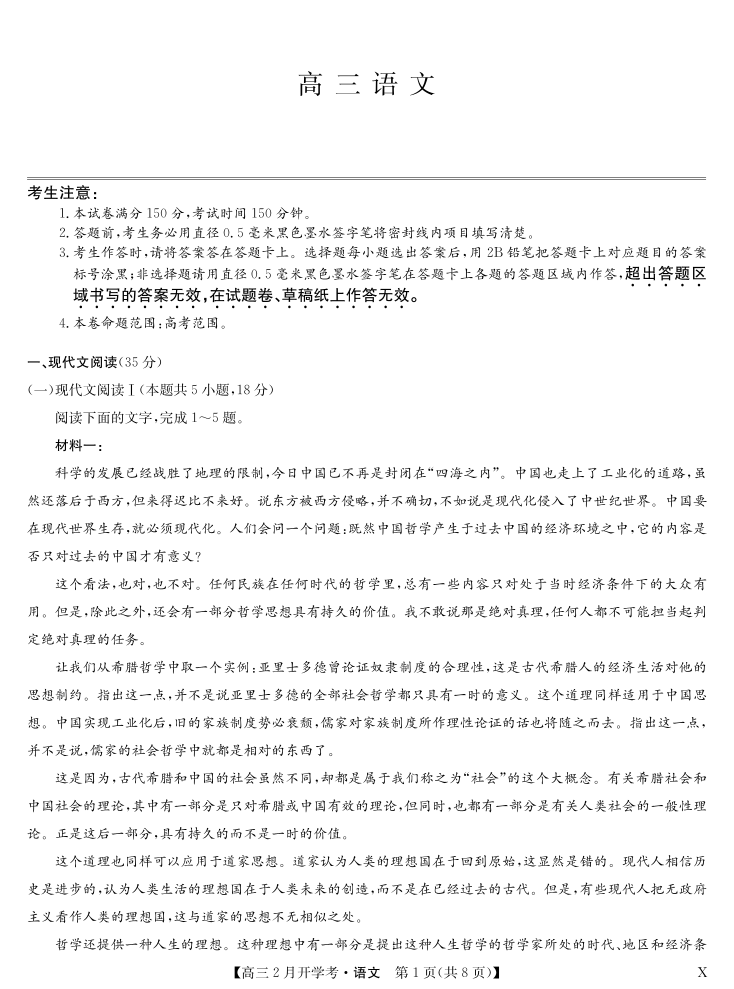 湖北部分学校2023-2024学年下学期高三2月开学考试 语文