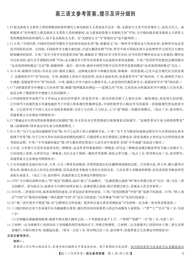 湖北部分学校2023-2024学年下学期高三2月开学考试 语文答案