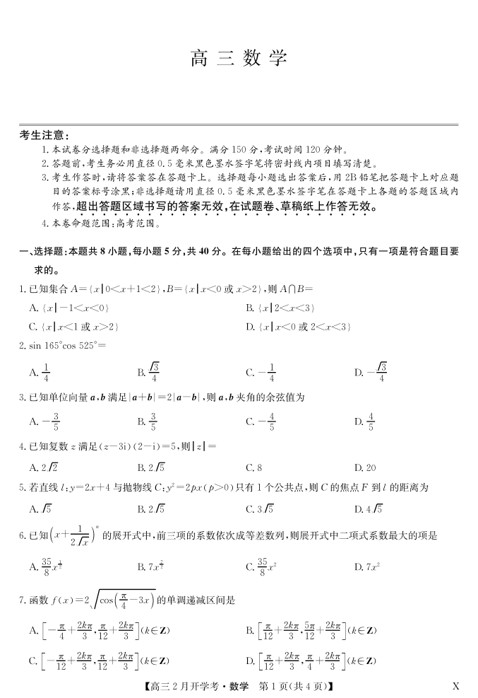 湖北部分学校2023-2024学年下学期高三2月开学考试 数学