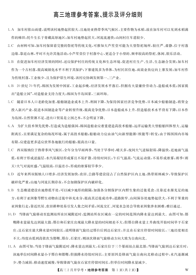 湖北部分学校2023-2024学年下学期高三2月开学考试 地理答案