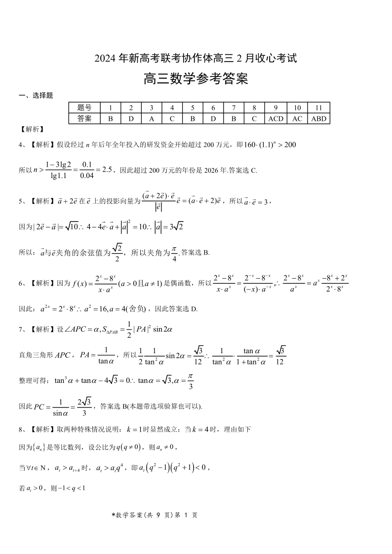 湖北省新高考联考协作体2023-2024学年高三下学期2月收心考试 数学答案