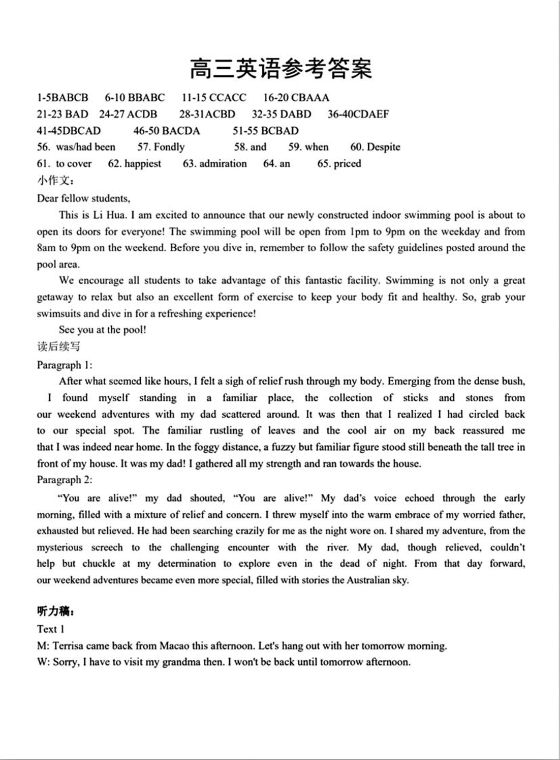 湖北省新高考联考协作体2023-2024学年高三下学期2月收心考试 英语答案