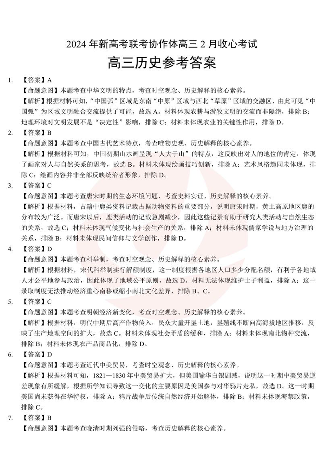 湖北省新高考联考协作体2023-2024学年高三下学期2月收心考试 历史答案