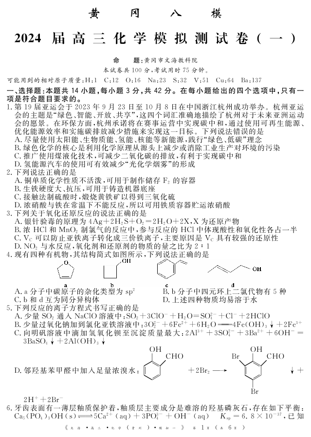 湖北省黄冈市2024届高三模拟测试卷(一)(黄冈八模)化学