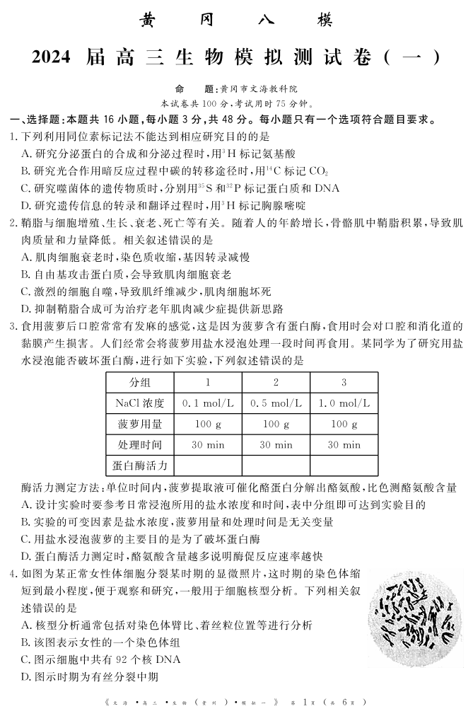 湖北省黄冈市2024届高三模拟测试卷(一)(黄冈八模)生物