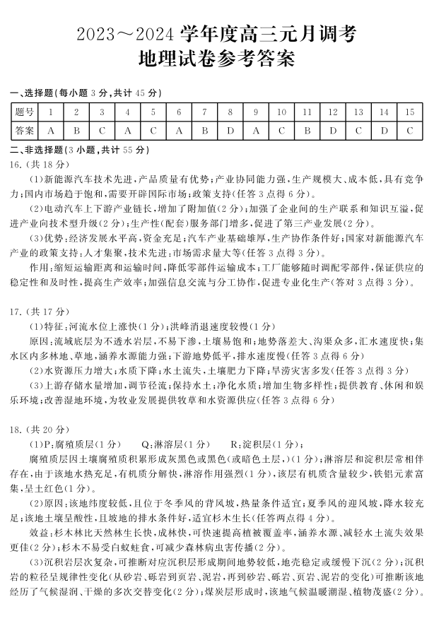 湖北省武汉市江岸区2023-2024学年高三上学期元月调考 地理答案