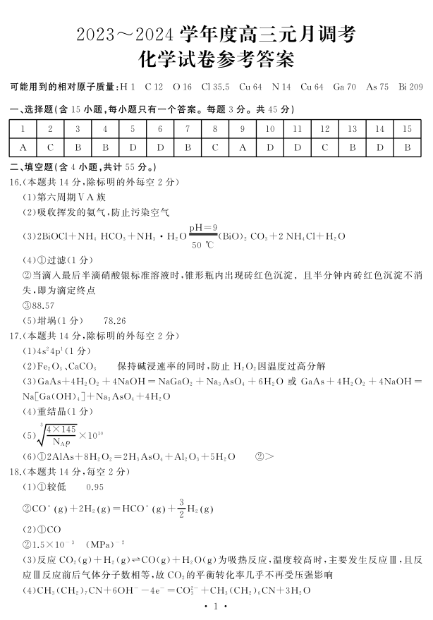 湖北省武汉市江岸区2023-2024学年高三上学期元月调考 化学答案