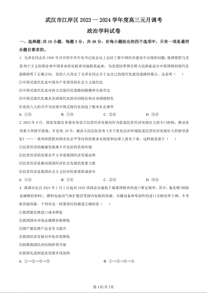 湖北省武汉市江岸区2023-2024学年高三上学期元月调考 政治