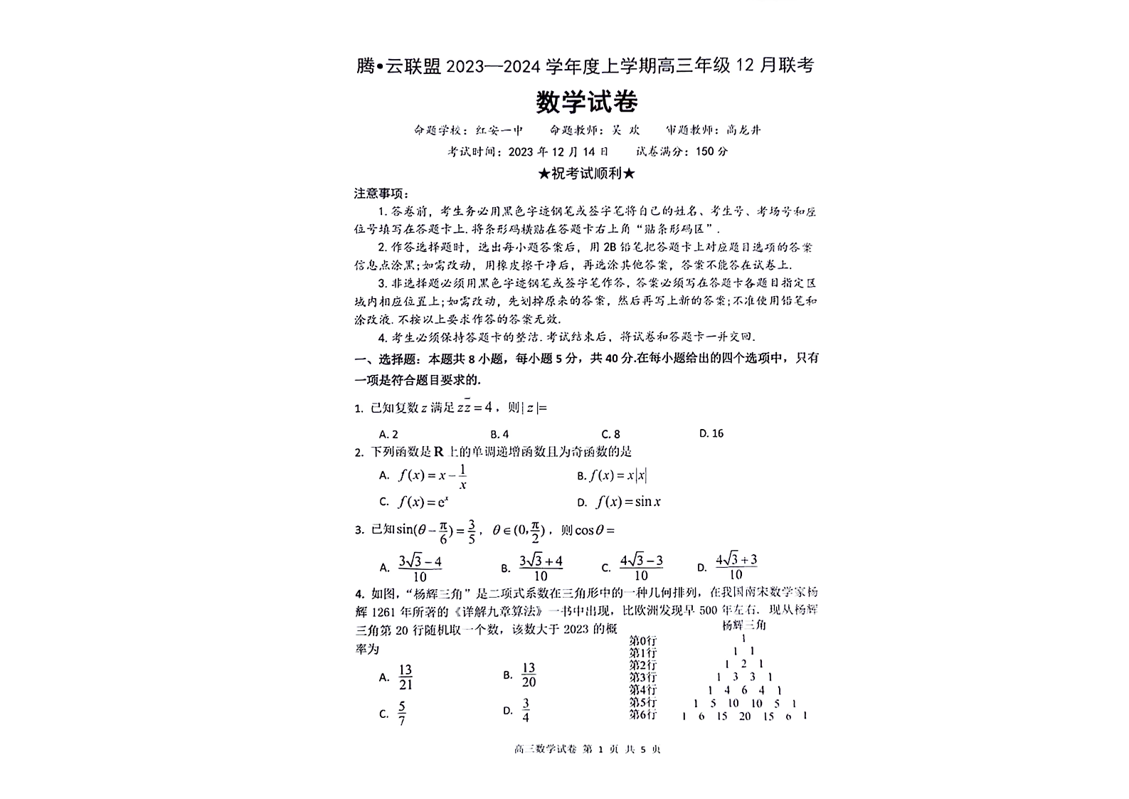 湖北省腾云联盟2023-2024学年高三上学期12月联考 数学