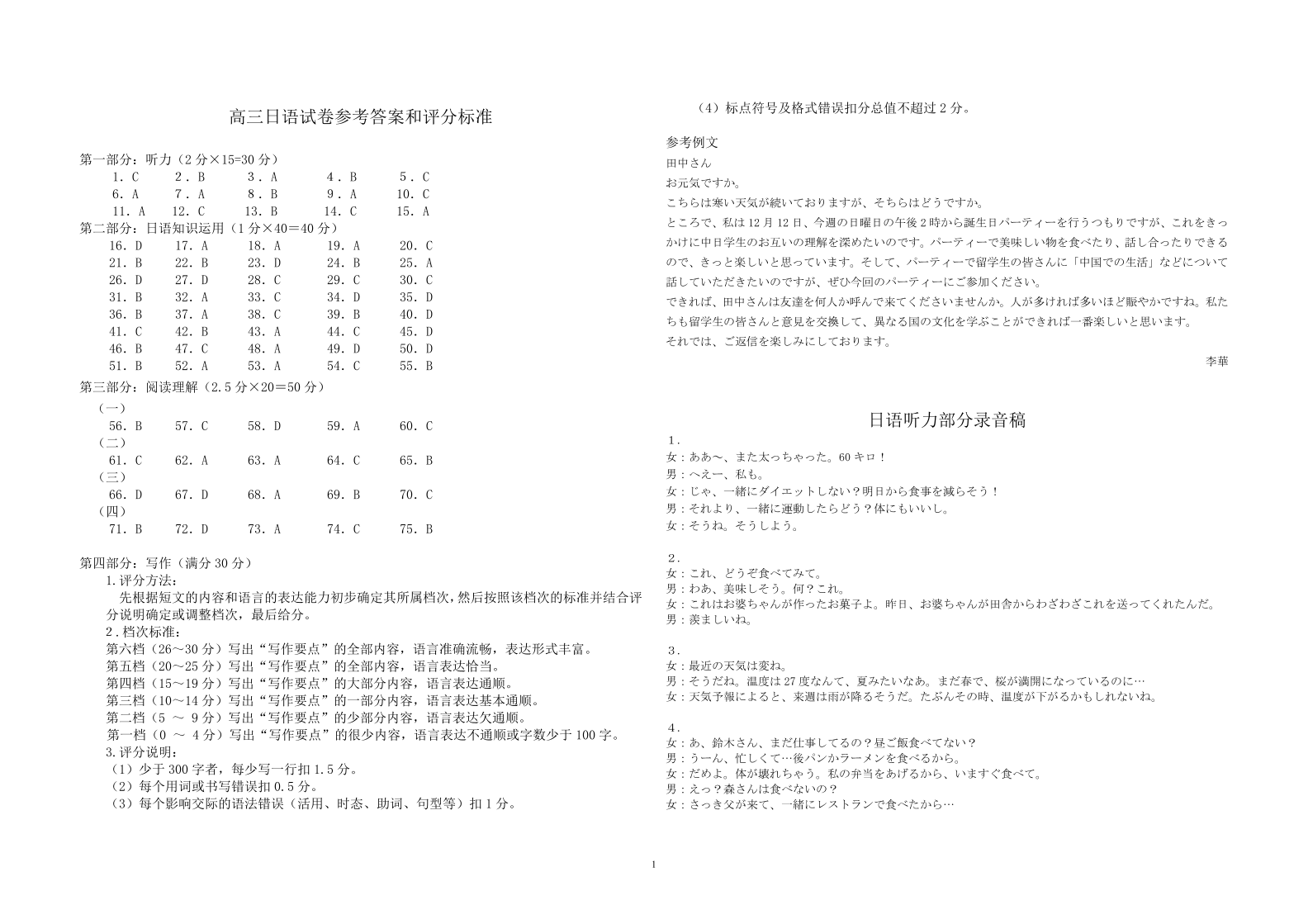 湖北省腾云联盟2023-2024学年高三上学期12月联考 日语答案