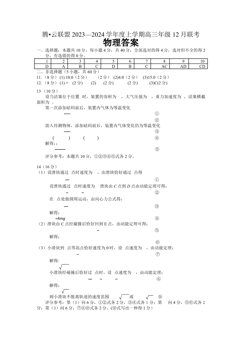 湖北省腾云联盟2023-2024学年高三上学期12月联考 物理答案