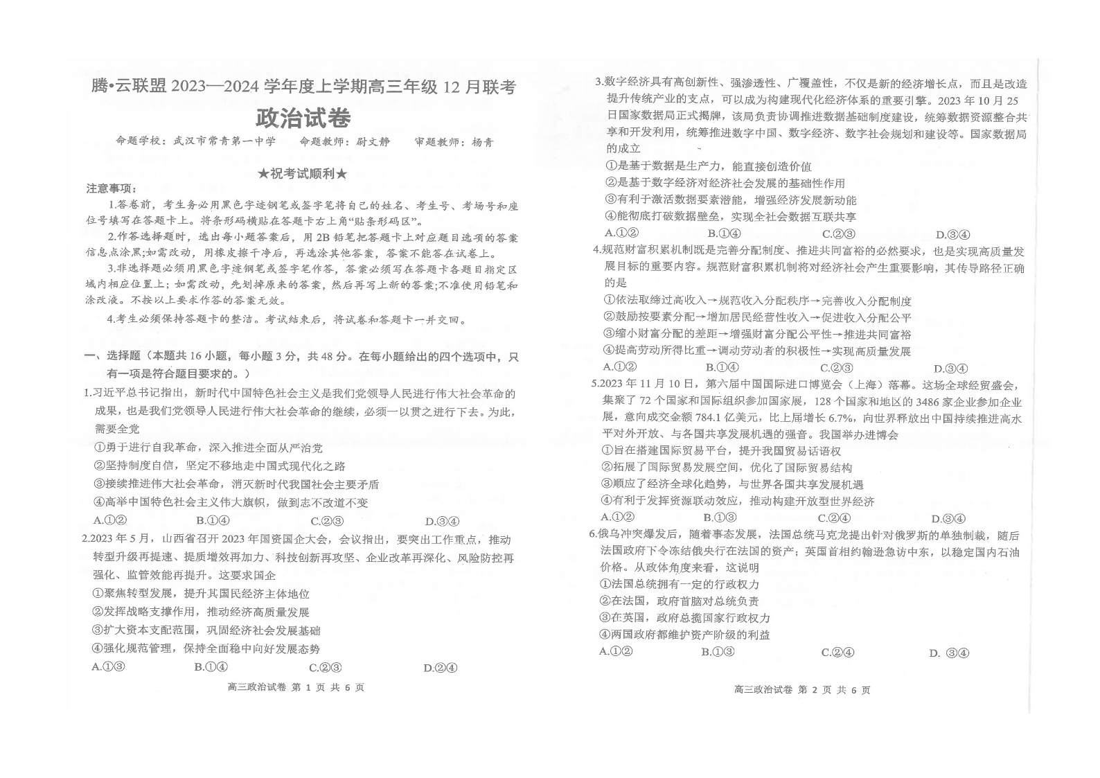 湖北省腾云联盟2023-2024学年高三上学期12月联考 政治