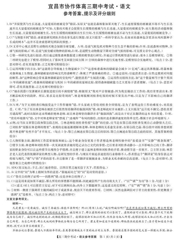 湖北省宜昌市协作体2023-2024学年高三上学期期中考试 语文答案
