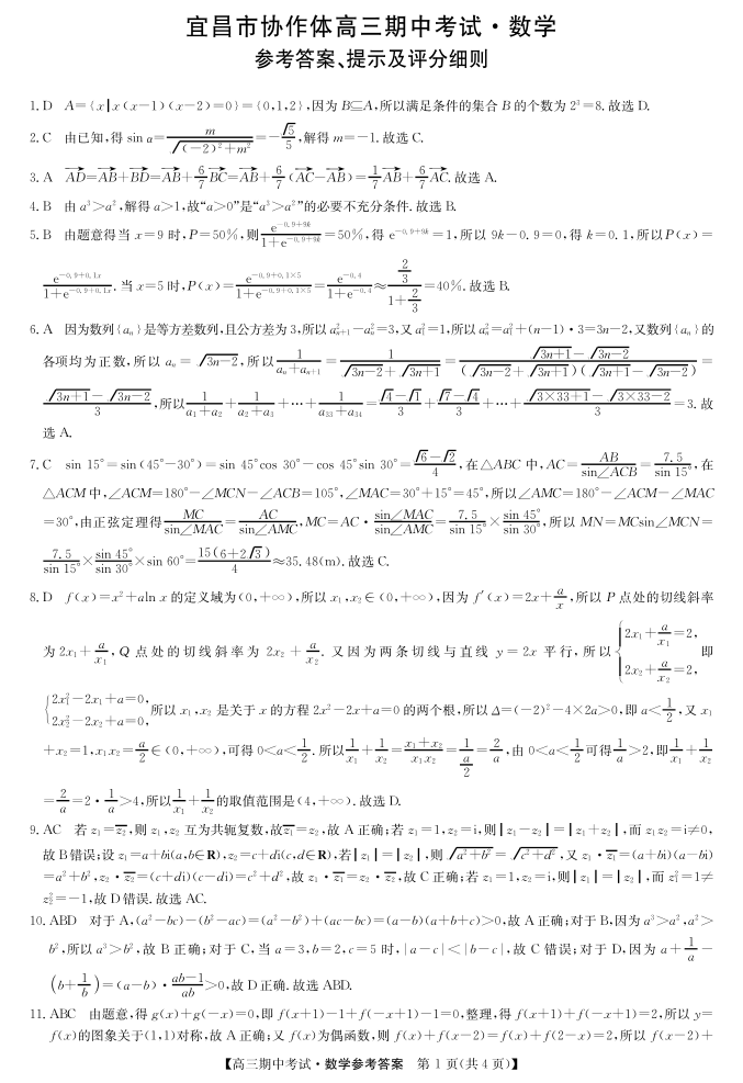 湖北省宜昌市协作体2023-2024学年高三上学期期中考试 数学答案