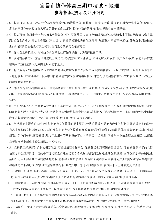湖北省宜昌市协作体2023-2024学年高三上学期期中考试 地理答案