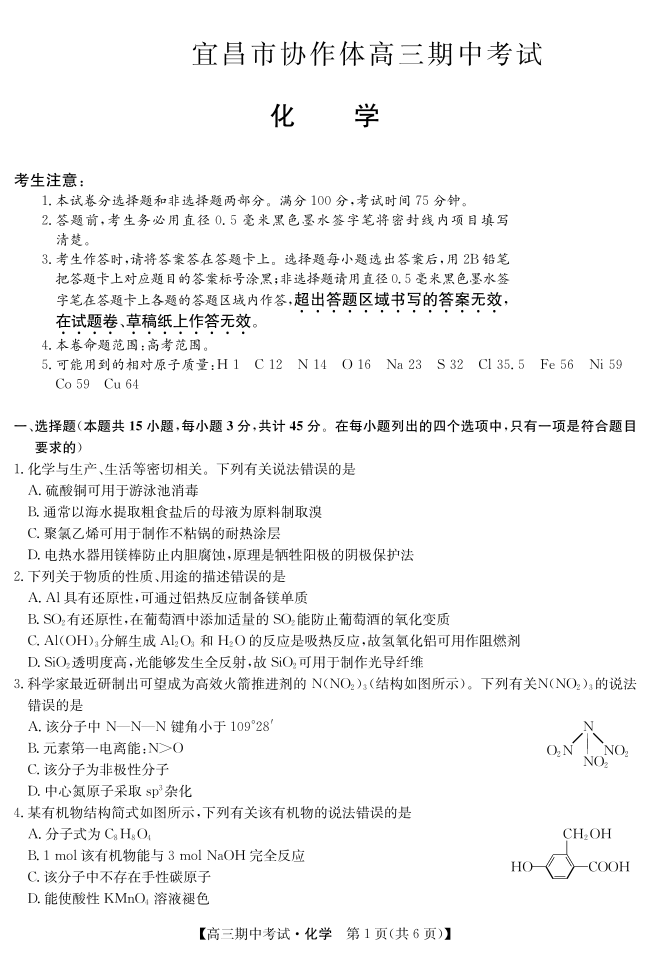 湖北省宜昌市协作体2023-2024学年高三上学期期中考试 化学