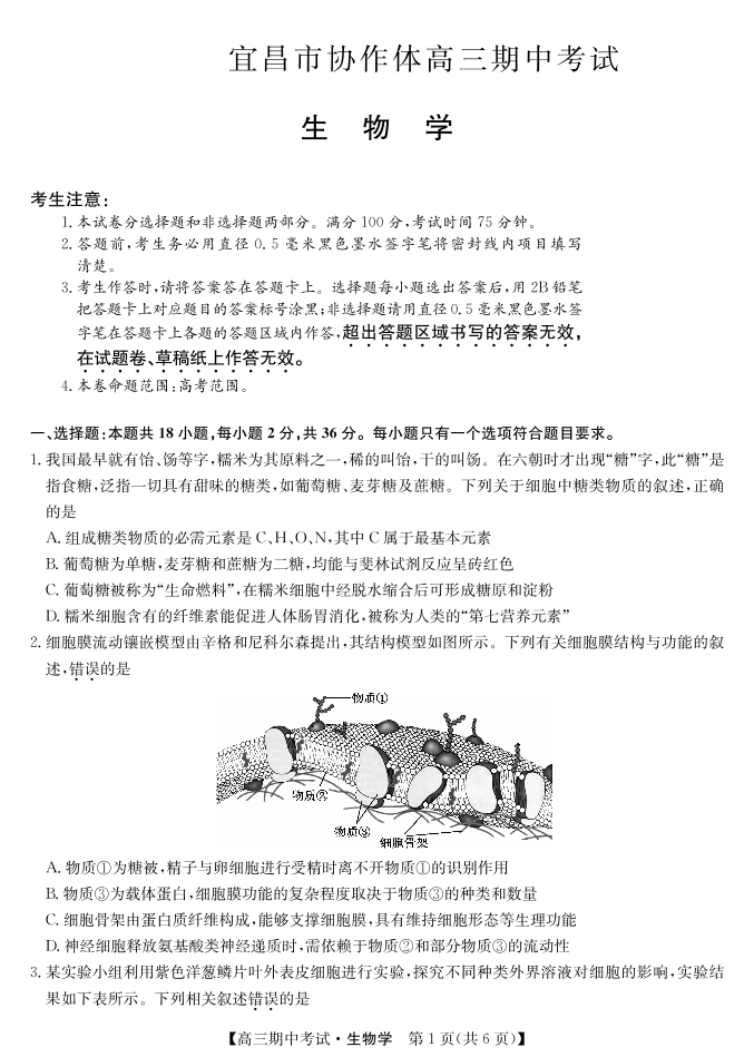 湖北省宜昌市协作体2023-2024学年高三上学期期中考试 生物