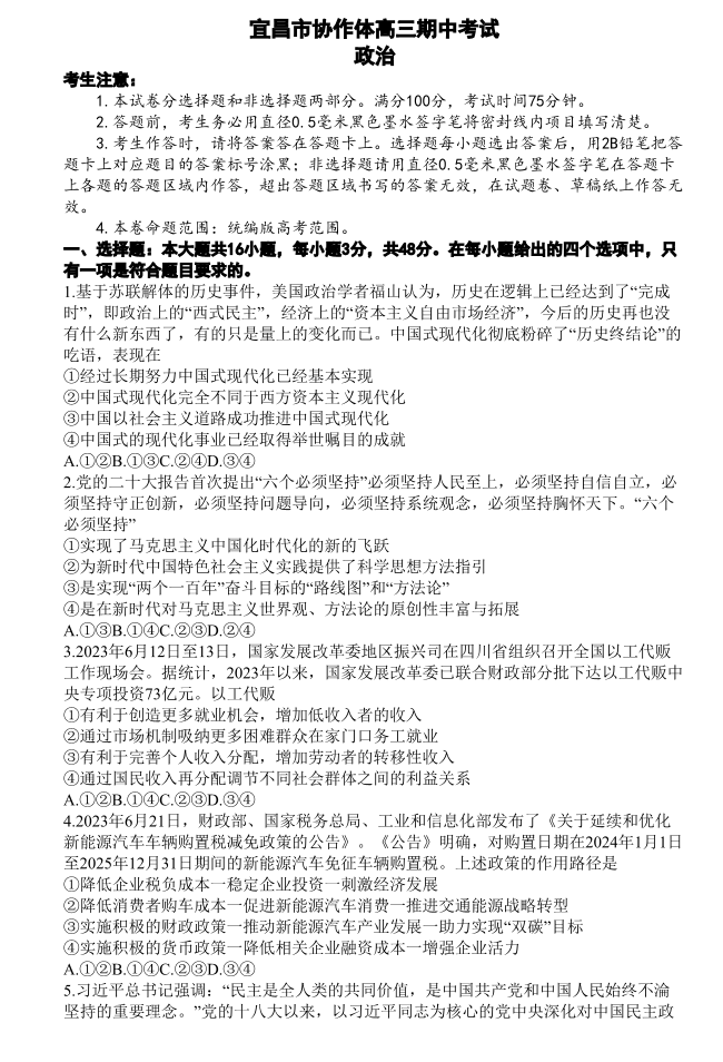 湖北省宜昌市协作体2023-2024学年高三上学期期中考试 政治