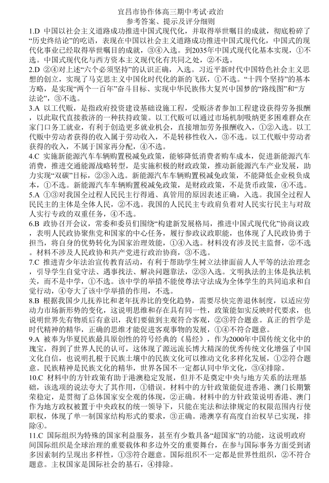 湖北省宜昌市协作体2023-2024学年高三上学期期中考试 政治答案