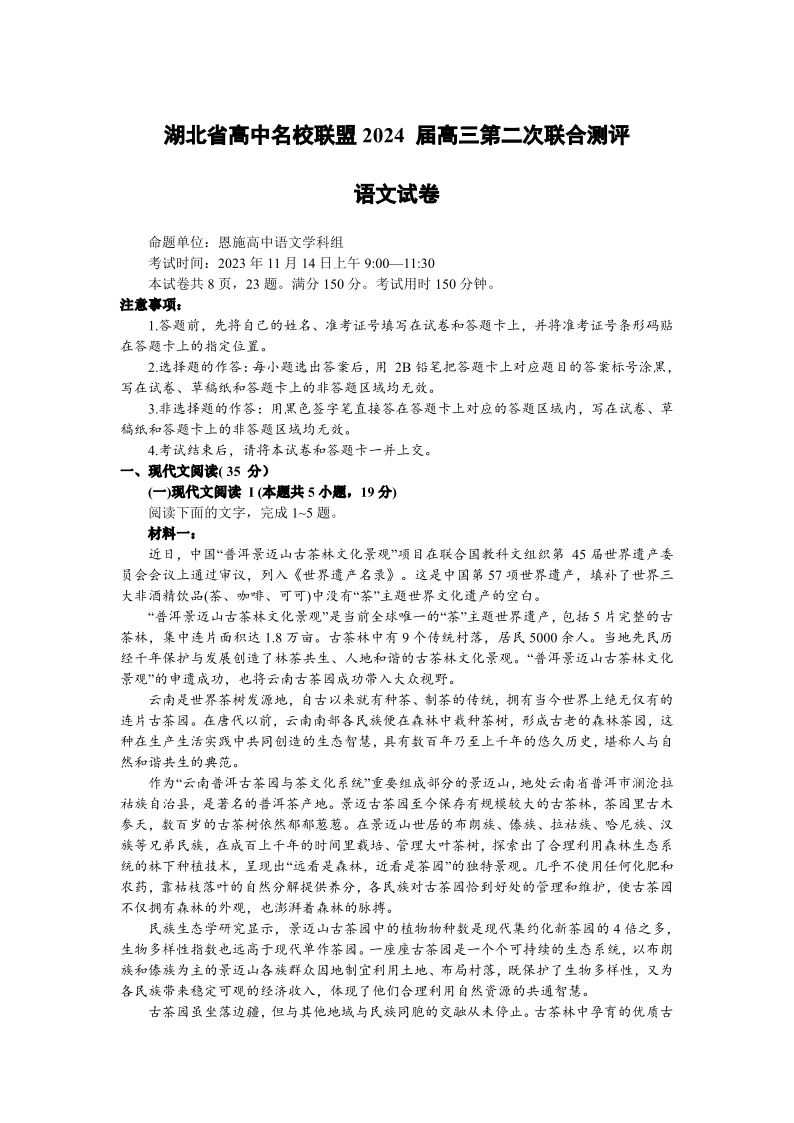 湖北省高中名校联盟2024届高三第二次联合测评 语文