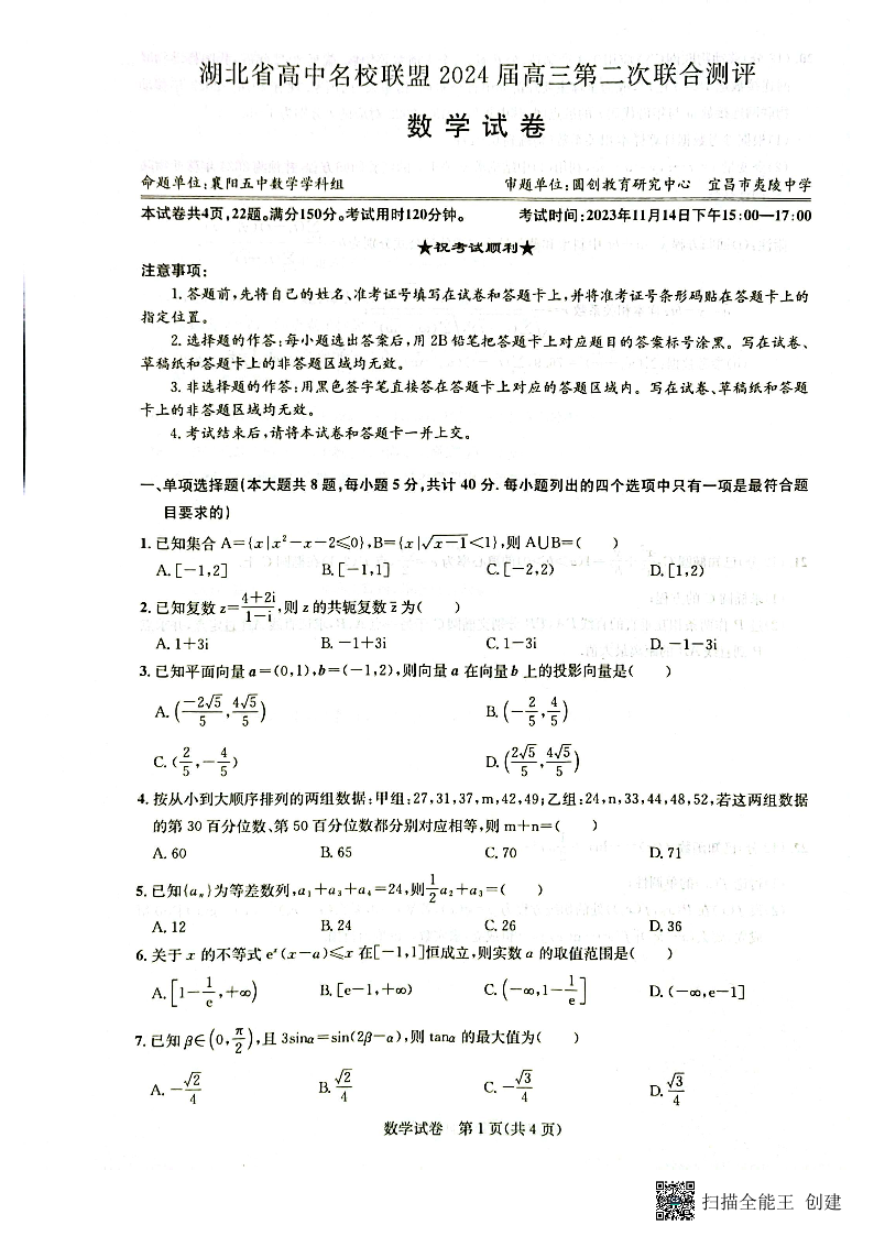 湖北省高中名校联盟2024届高三第二次联合测评 数学