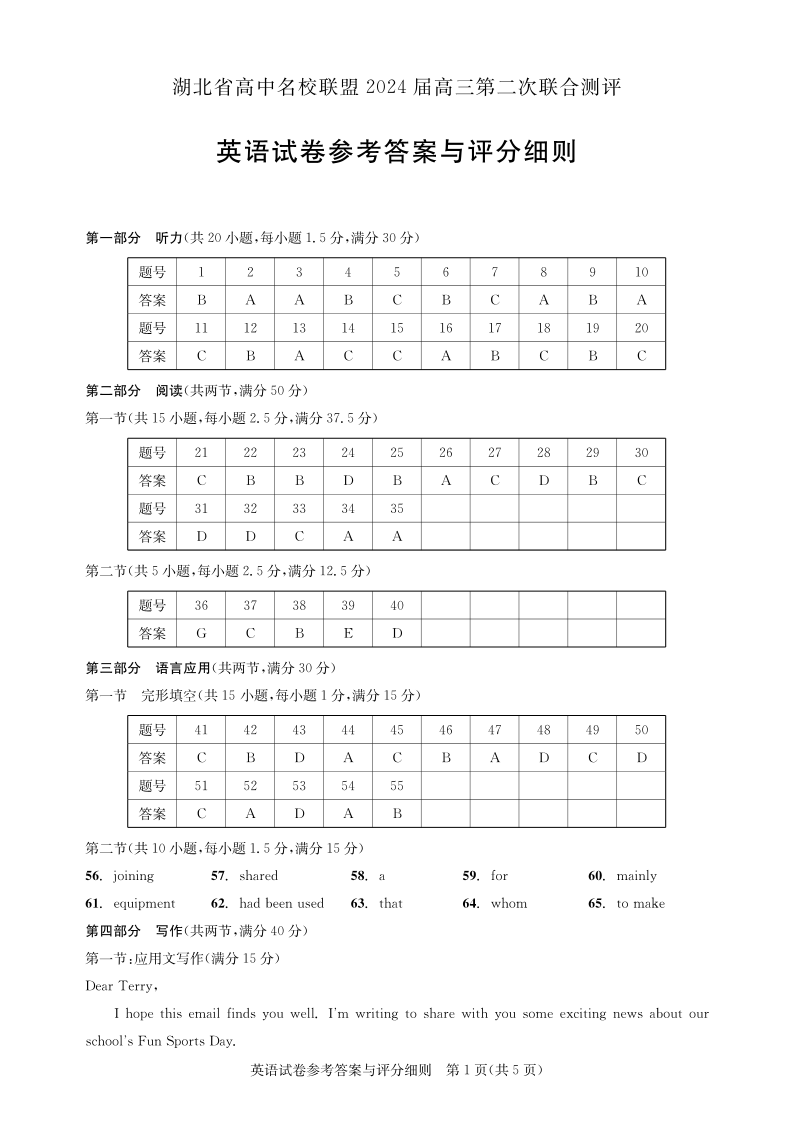 湖北省高中名校联盟2024届高三第二次联合测评 英语答案