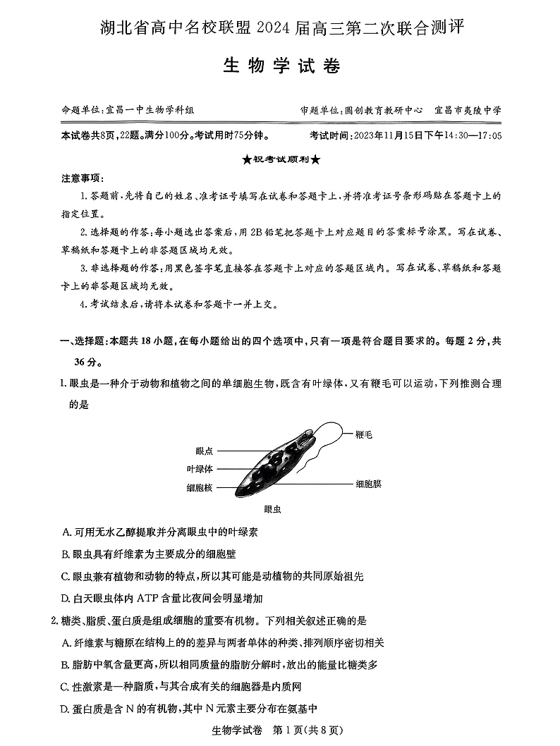 湖北省高中名校联盟2024届高三第二次联合测评 生物