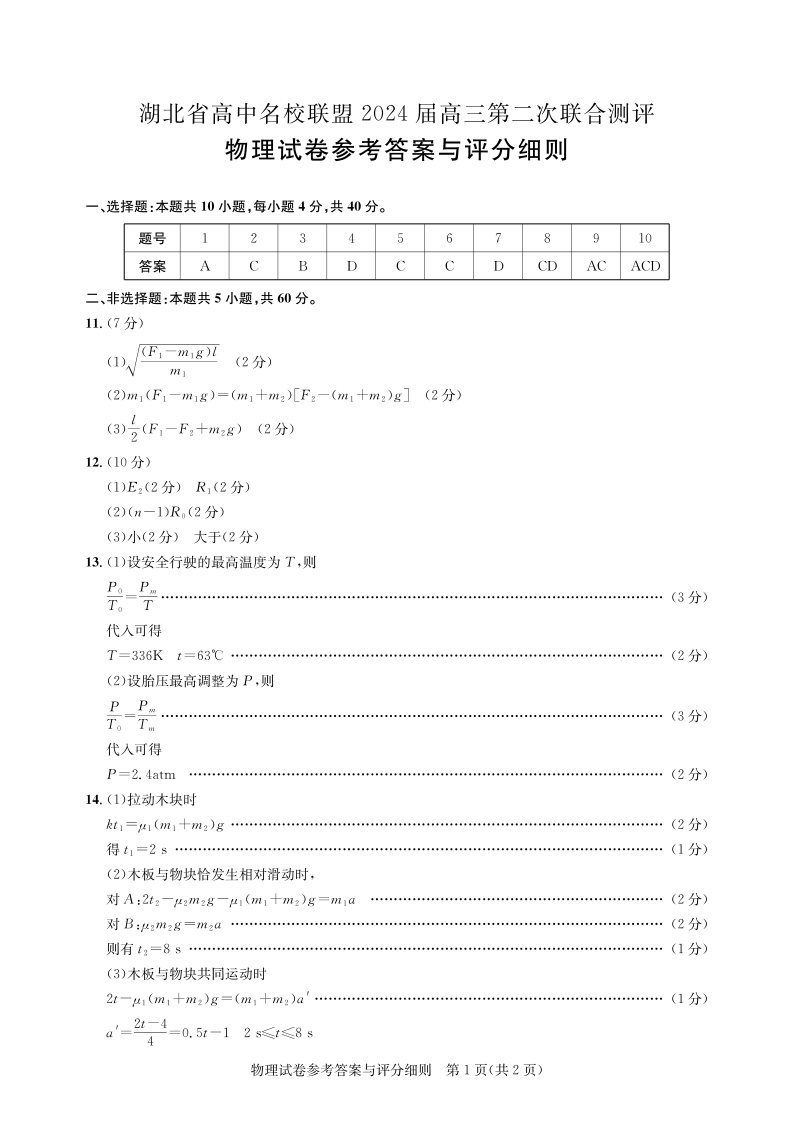 湖北省高中名校联盟2024届高三第二次联合测评 物理答案