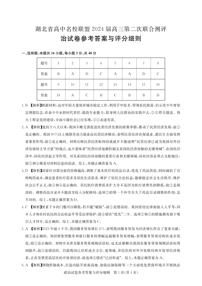 湖北省高中名校联盟2024届高三第二次联合测评 政治答案