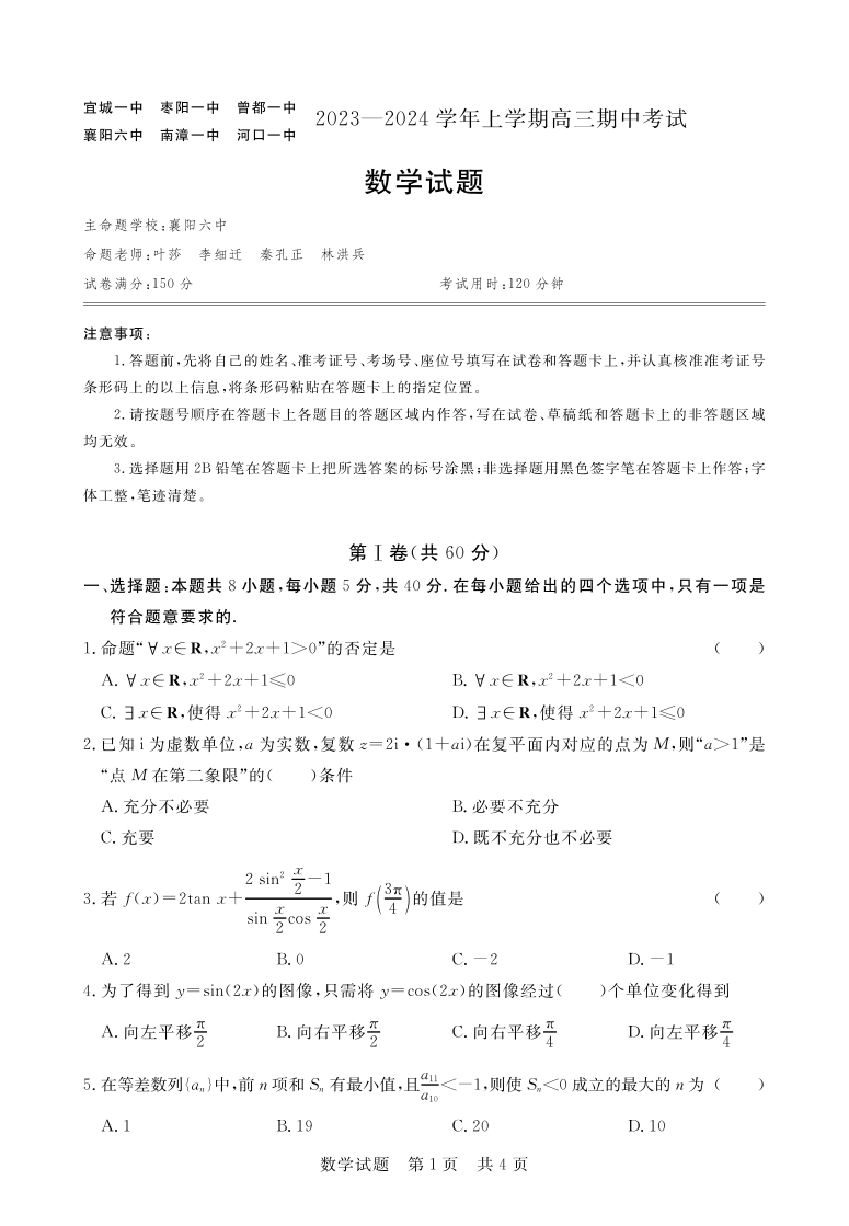湖北省宜城市第一中学等六校2023-2024学年高三上学期期中考试 数学