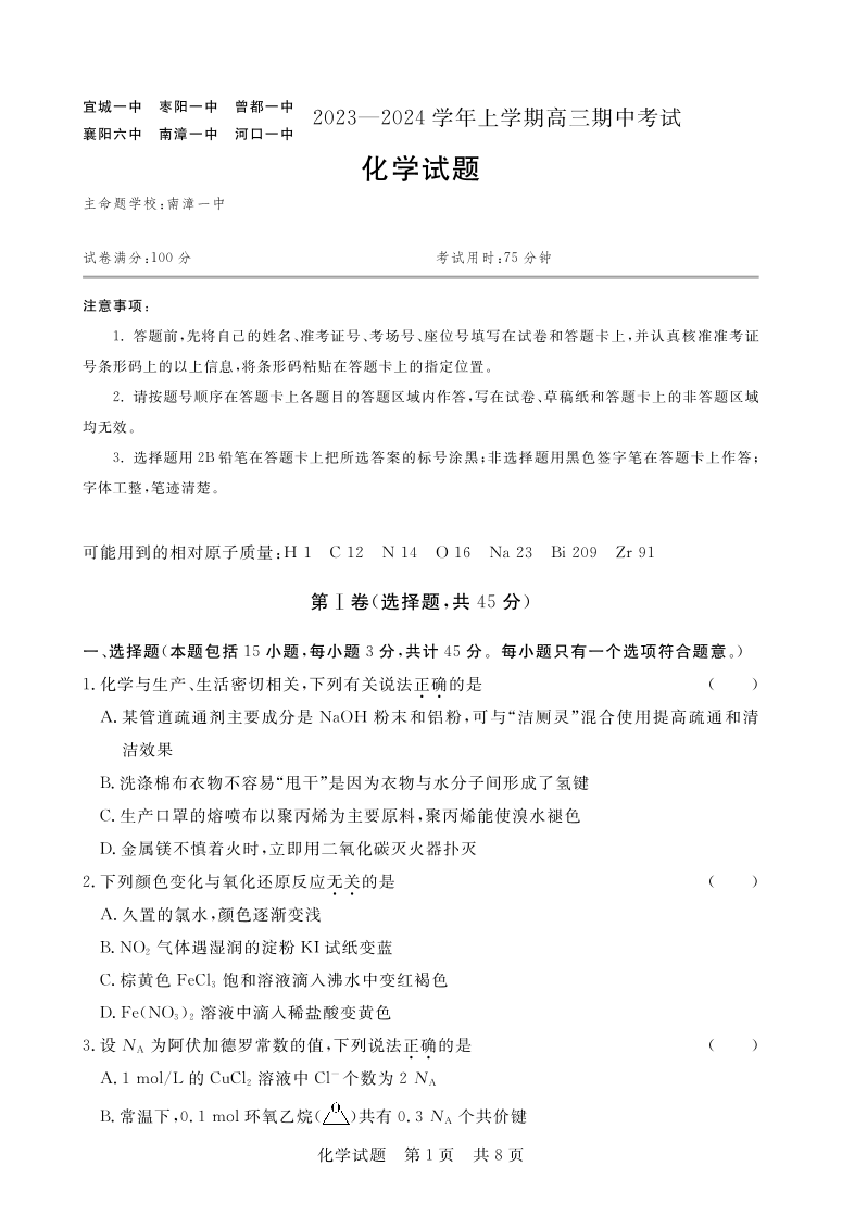 湖北省宜城市第一中学等六校2023-2024学年高三上学期期中考试 化学