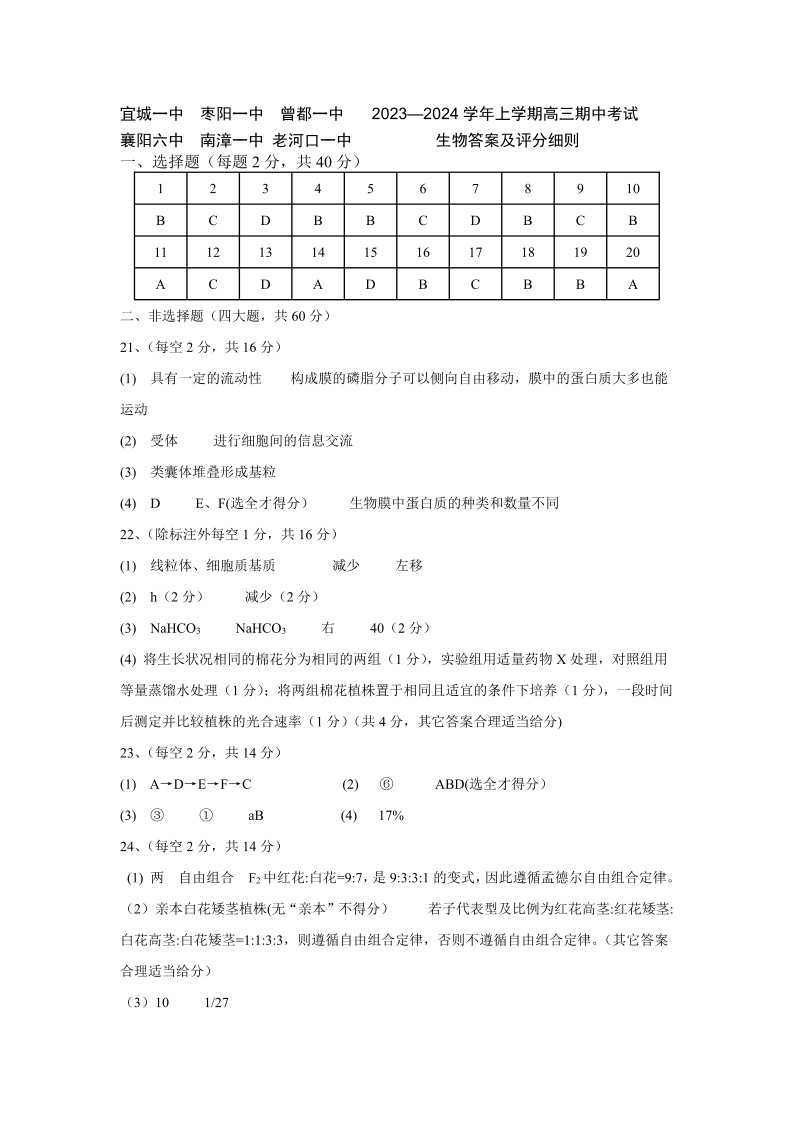 湖北省宜城市第一中学等六校2023-2024学年高三上学期期中考试 生物答案