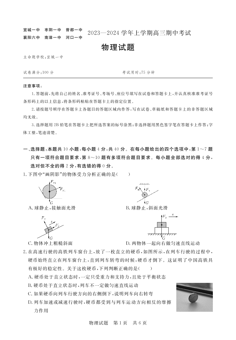湖北省宜城市第一中学等六校2023-2024学年高三上学期期中考试 物理
