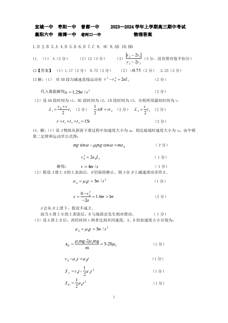 湖北省宜城市第一中学等六校2023-2024学年高三上学期期中考试 物理答案