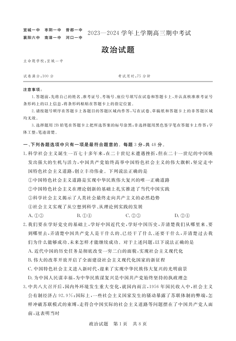 湖北省宜城市第一中学等六校2023-2024学年高三上学期期中考试 政治