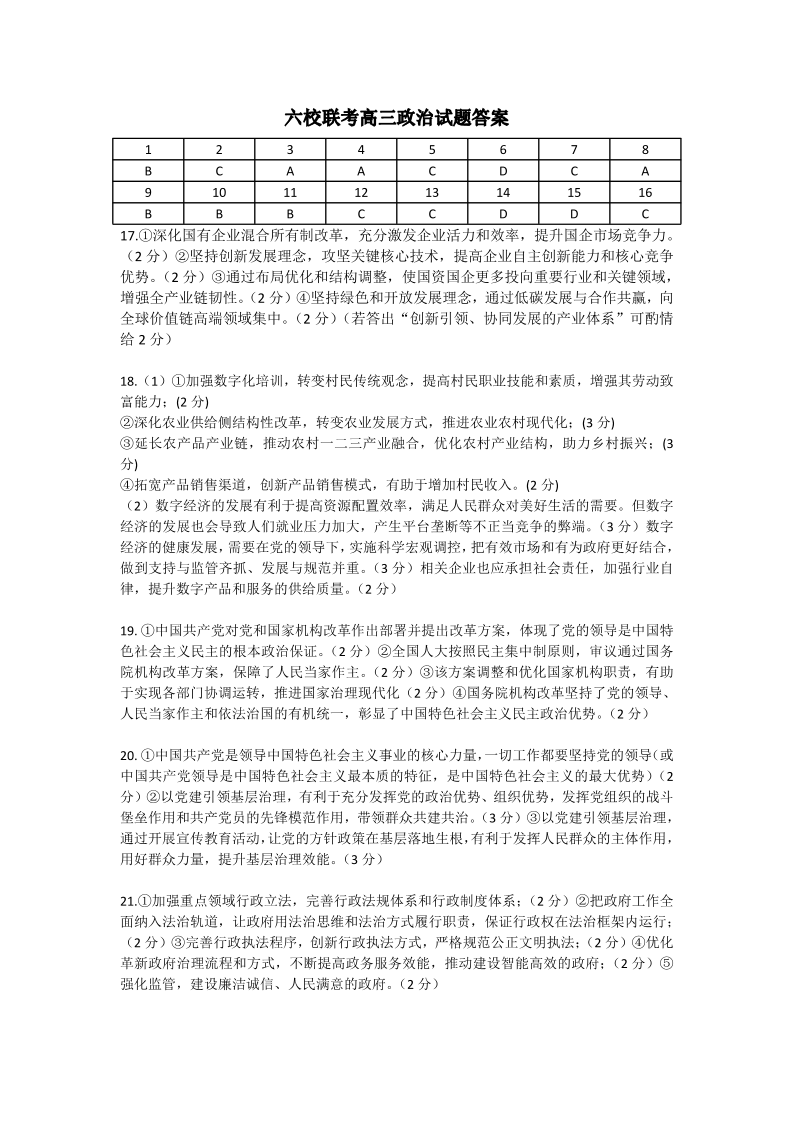 湖北省宜城市第一中学等六校2023-2024学年高三上学期期中考试 政治答案