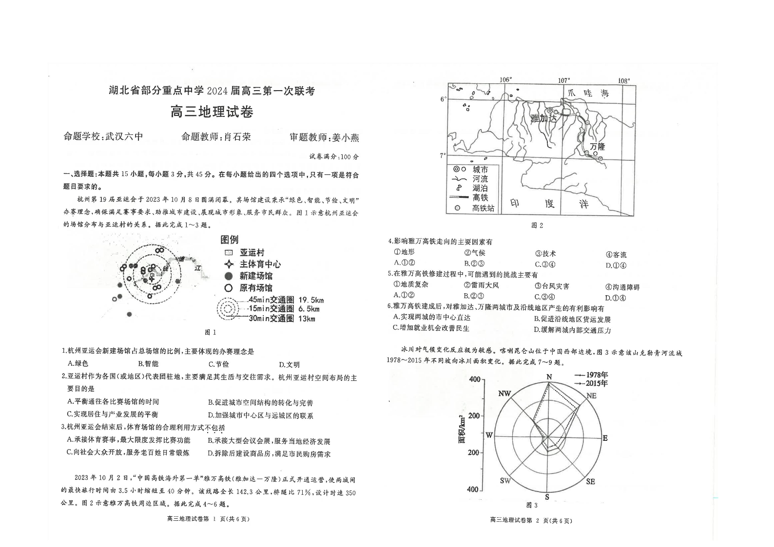湖北省部分重点中学2024届高三上学期第一次联考 地理