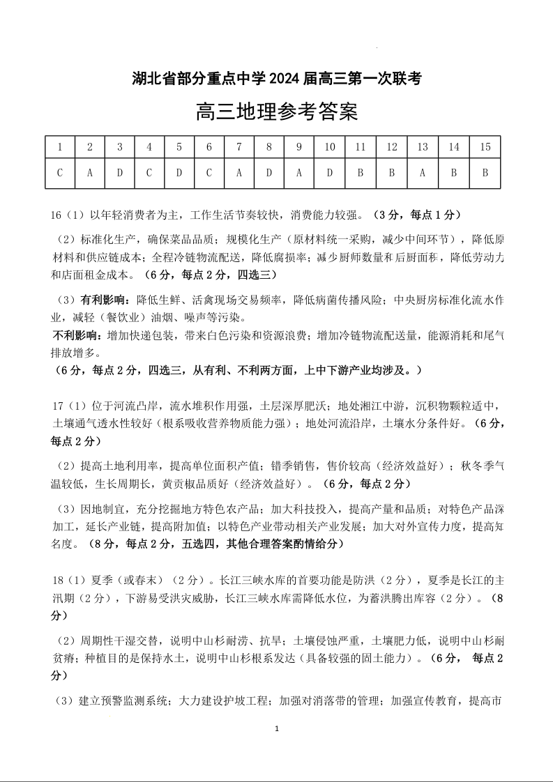 湖北省部分重点中学2024届高三上学期第一次联考 地理答案