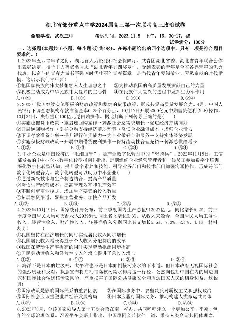 湖北省部分重点中学2024届高三上学期第一次联考 政治