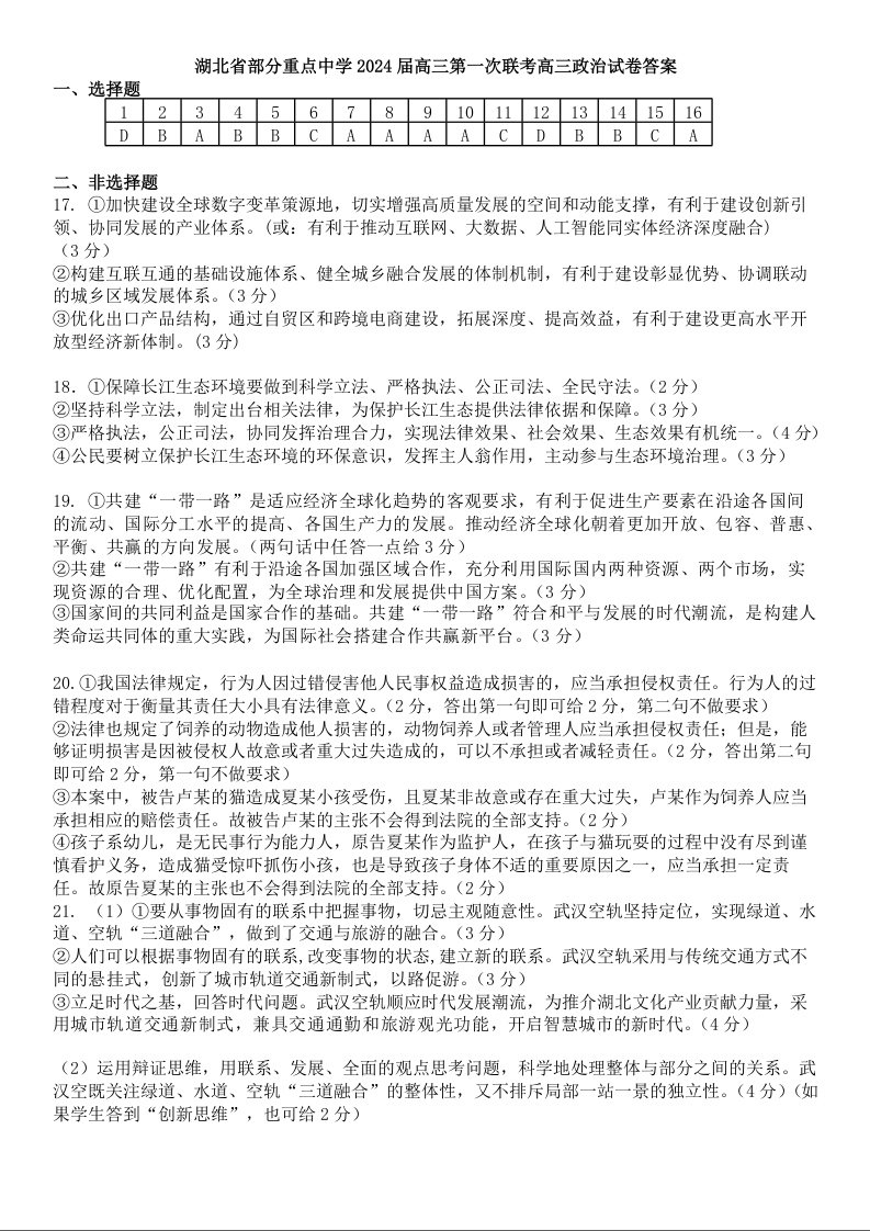 湖北省部分重点中学2024届高三上学期第一次联考 政治答案