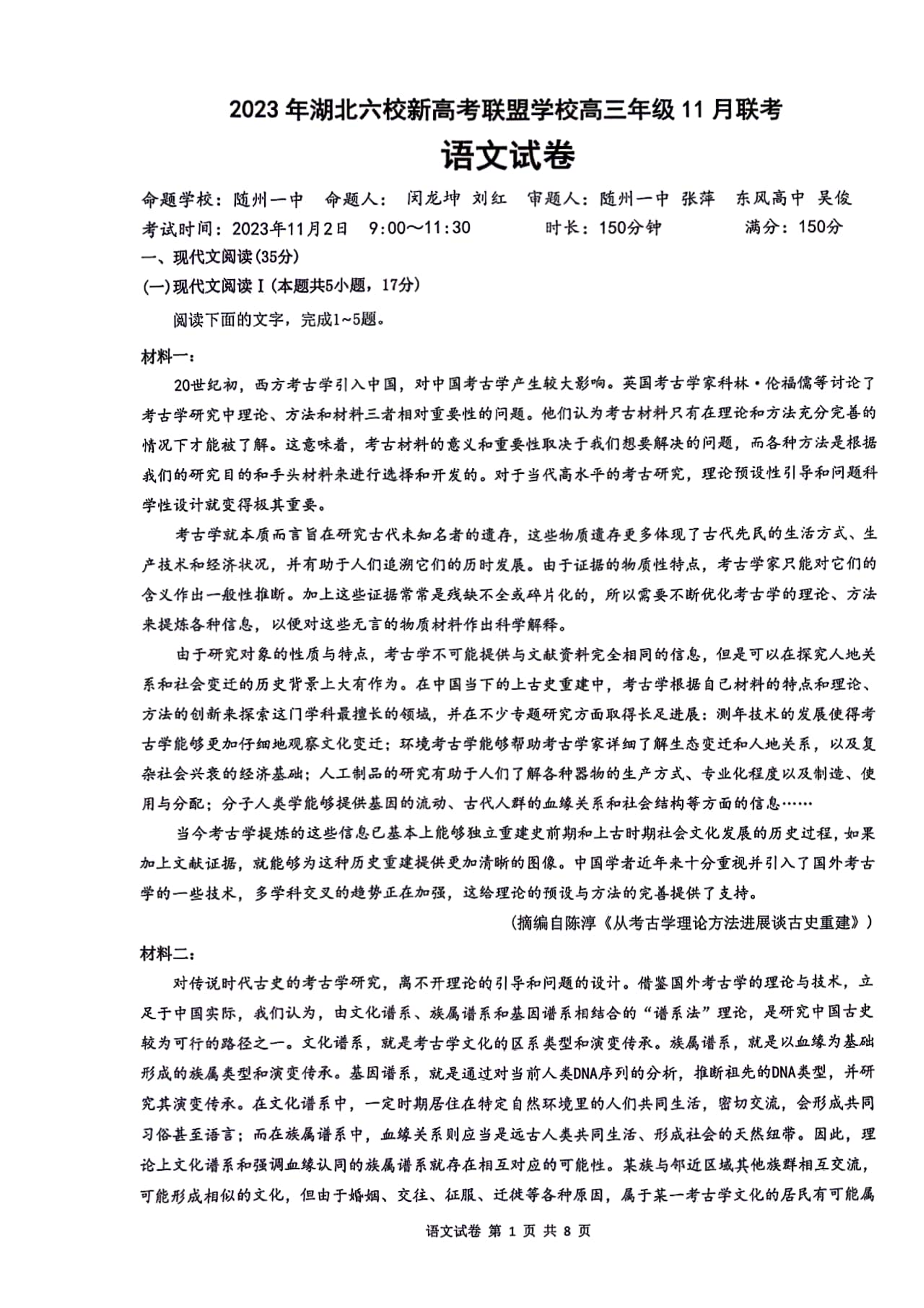 湖北省六校新高考联盟学校2023-2024学年高三上学期11月联考 语文