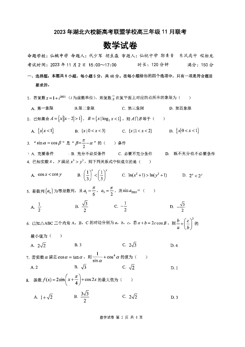 湖北省六校新高考联盟学校2023-2024学年高三上学期11月联考 数学
