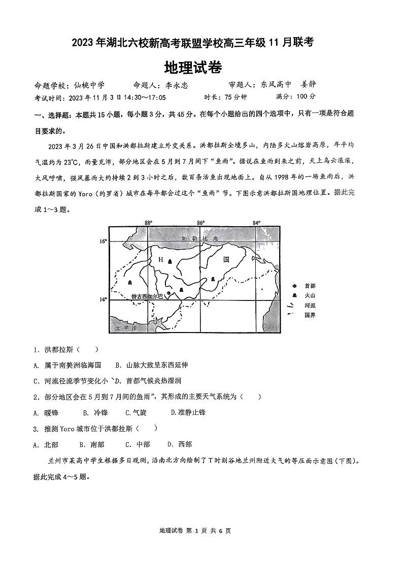湖北省六校新高考联盟学校2023-2024学年高三上学期11月联考 地理