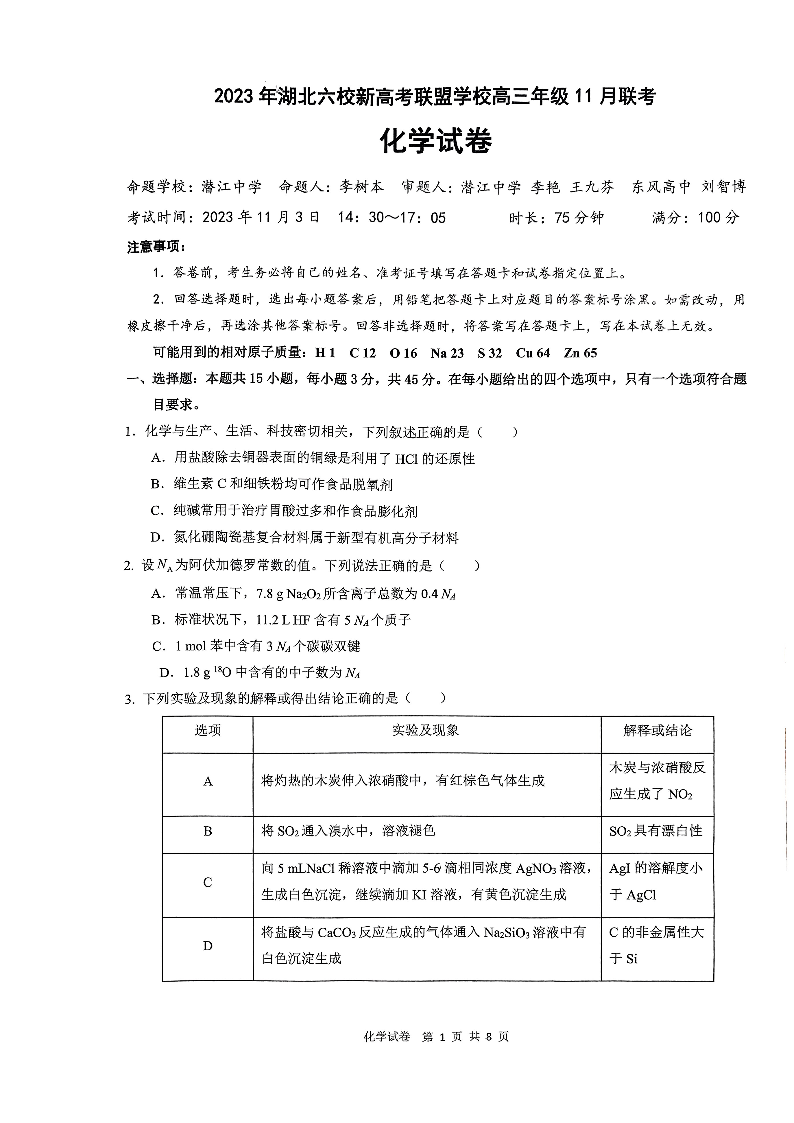 湖北省六校新高考联盟学校2023-2024学年高三上学期11月联考 化学