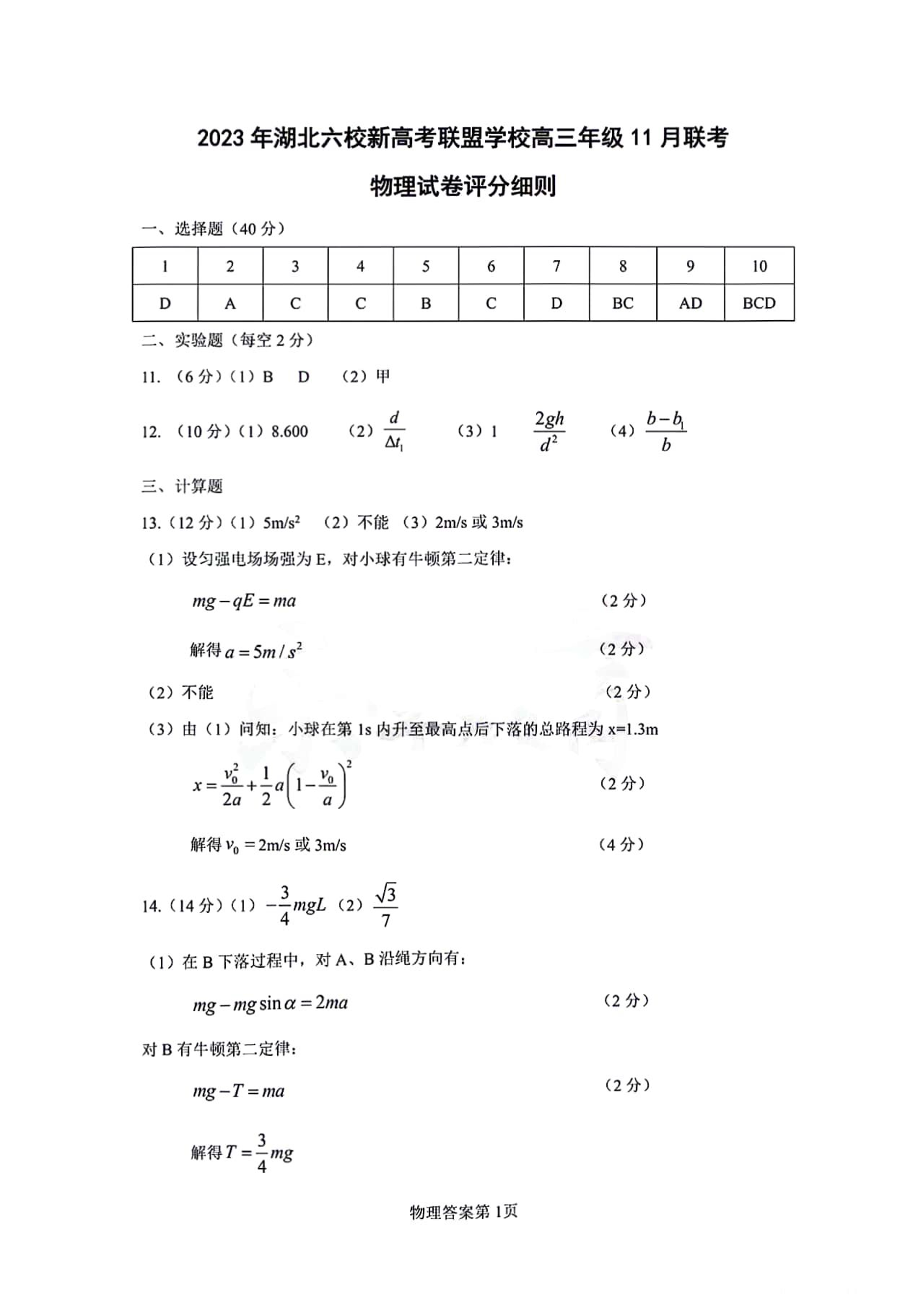 湖北省六校新高考联盟学校2023-2024学年高三上学期11月联考 物理答案