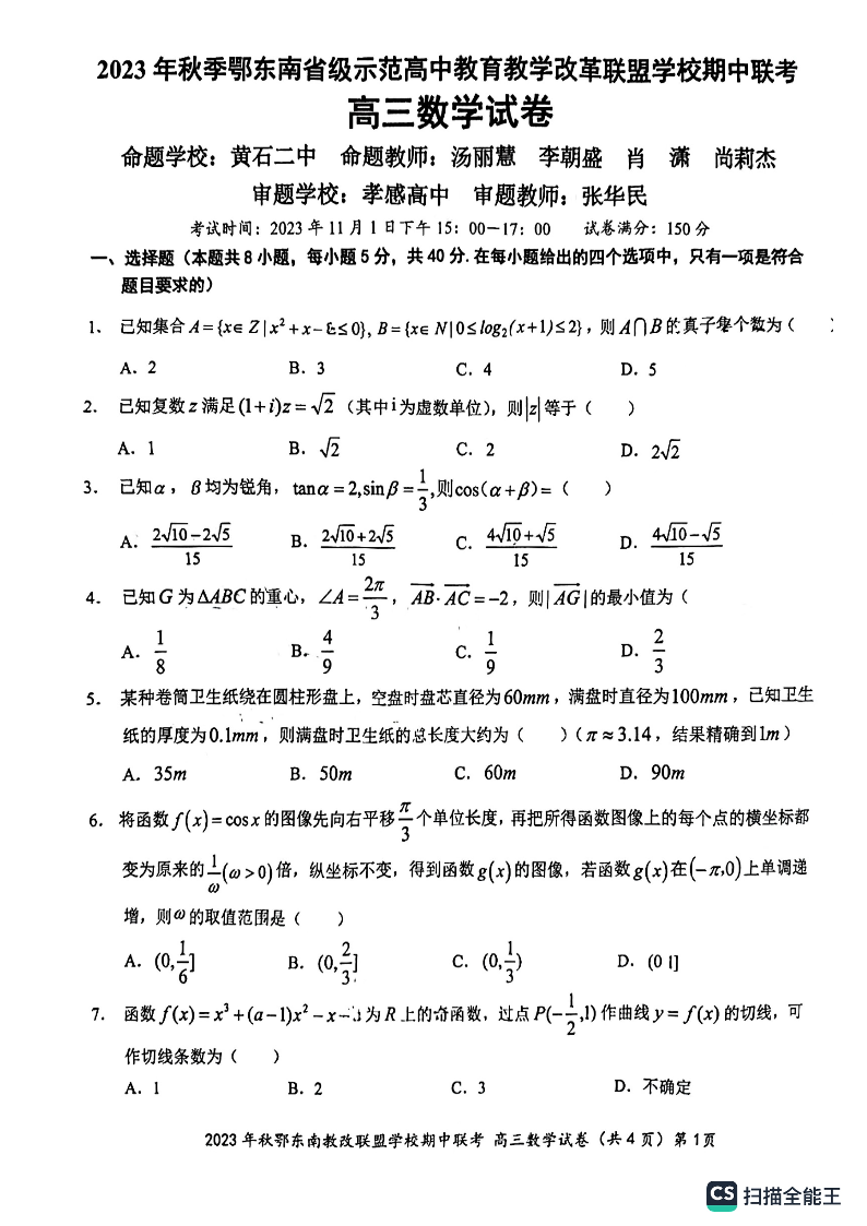 湖北省鄂东南省级示范高中教育教学改革联盟学校2023-2024学年高三上学期期中联考 数学