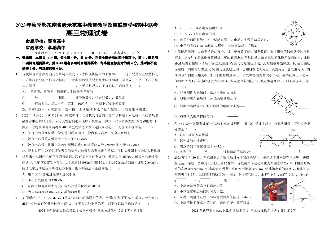 湖北省鄂东南省级示范高中教育教学改革联盟学校2023-2024学年高三上学期期中联考 物理